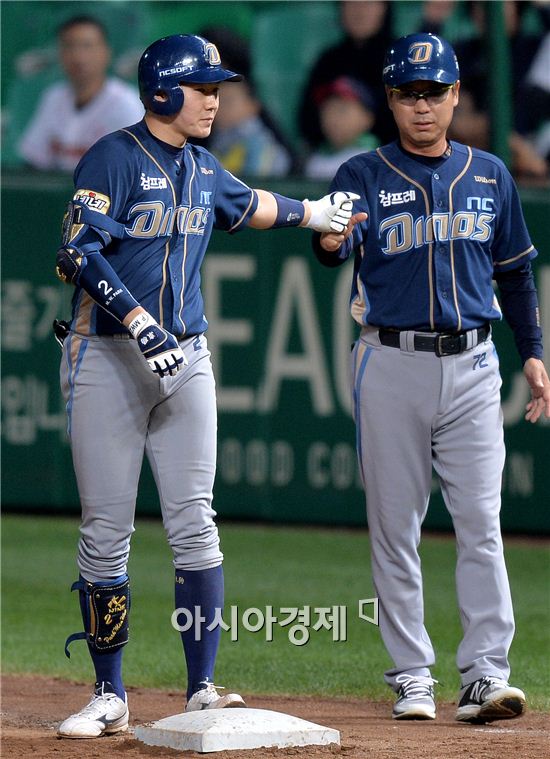 [인천=아시아경제 김현민 기자] 2015 KBO리그 NC 다이노스와 SK 와이번스의 경기가 2일 문학구장에서 열렸다. 6회초 1사 만루에서 NC 박민우가 추가 2타점 적시타를 치고 전준호 코치와 하이파이브하고 있다.