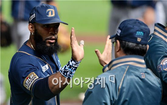 [인천=아시아경제 김현민 기자] 프로야구 NC 다이노스가 2일 인천 문학구장에서 열린 2015 KBO리그 SK 와이번스의 경기에서 9-2로 이기면 5연승을 달렸다. 이날 경기에서 프로야구 최초 40-40을 달성한 테임즈가 김경문 감독과 하이파이브하고 있다.