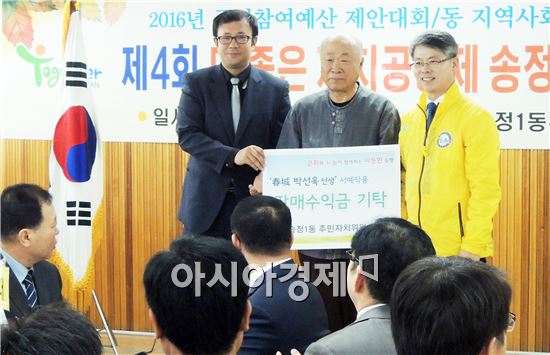 [아시아경제 노해섭 기자]광주시 광산구 송정1동 주민자치위원회(위원장 강관민)는 5일 주민자치 위원인 춘성(春城) 박선옥 작가의 서예작품을 전시·판매해 얻은 수익금을 투게더광산 나눔문화재단에 전달했다.