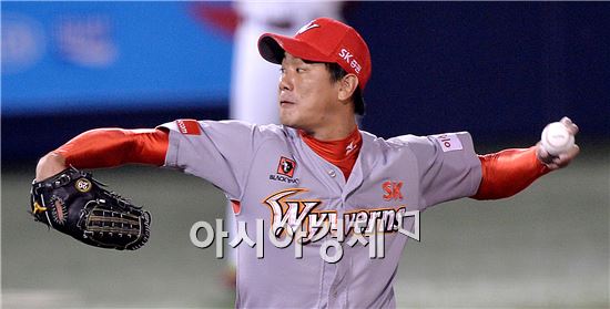 [목동=아시아경제 김현민 기자] 프로야구 2015 포스트시즌 SK 와이번스와 넥센 히어로즈의 와일드카드결정 1차전이 7일 목동구장에서 열렸다. SK 선발투수 김광현이 역투하고 있다.