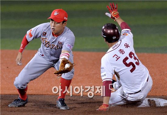 [목동=아시아경제 김현민 기자] 프로야구 2015 포스트시즌 SK 와이번스와 넥센 히어로즈의 와일드카드결정 1차전이 7일 목동구장에서 열렸다. 1회말 1사 1루에서 넥센 이택근 타석 때 1루주자 고종욱이 2루 도루에 성공하고 있다. SK 2루수는 나주환.
