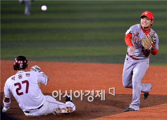 [목동=아시아경제 김현민 기자] 프로야구 2015 포스트시즌 SK 와이번스와 넥센 히어로즈의 와일드카드결정 1차전이 7일 목동구장에서 열렸다. 2회말 1사 1루에서 SK 유격수 김성현이 넥센 서건창의 2루수 땅볼 때 1루주자 박동원을 포스아웃시키고 1루로 송구해 병살처리하고 있다.