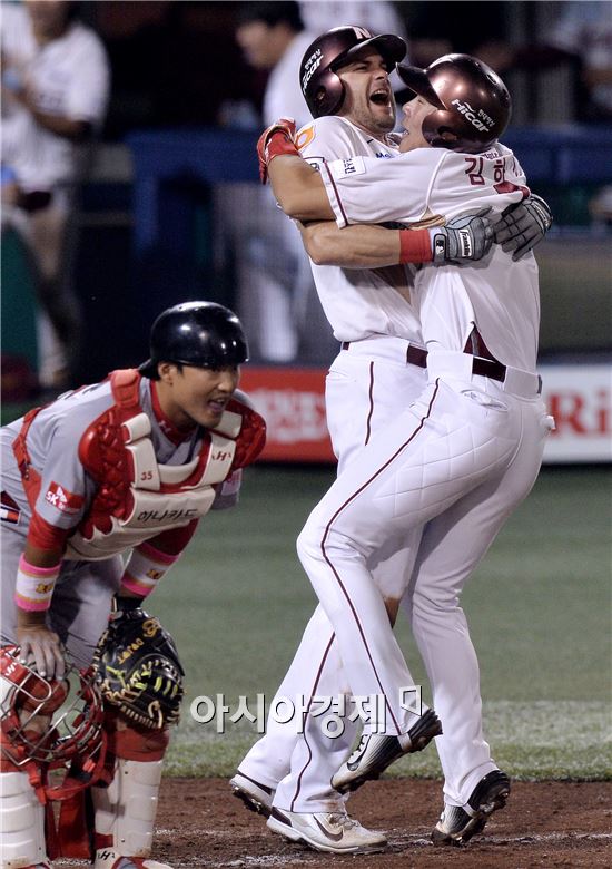 [목동=아시아경제 김현민 기자] 프로야구 2015 포스트시즌 SK 와이번스와 넥센 히어로즈의 와일드카드결정 1차전이 7일 목동구장에서 열렸다. 넥센 스나이더와 김하성이 연장 11회말 2사 만루에서 상대 실책으로 5-4 끝내기 승리를 확정한 뒤 기뻐하고 있다.