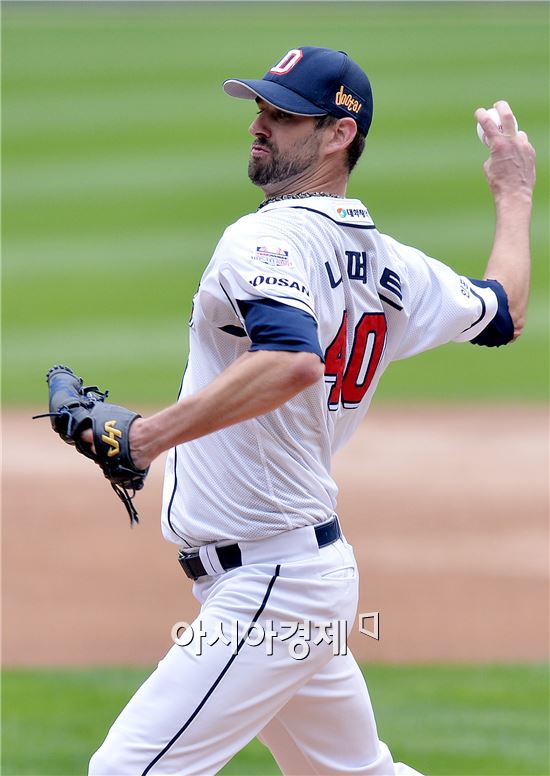 [잠실=아시아경제 김현민 기자] 프로야구 2015 포스트시즌 넥센 히어로즈와 두산 베어스의 준플레이오프 1차전이 10일 잠실구장에서 열렸다. 두산 선발 니퍼트가 역투하고 있다.