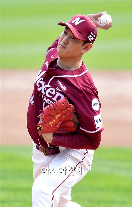 [잠실=아시아경제 김현민 기자] 프로야구 2015 포스트시즌 넥센 히어로즈와 두산 베어스의 준플레이오프 1차전이 10일 잠실구장에서 열렸다. 넥센 선발 양훈이 역투하고 있다.