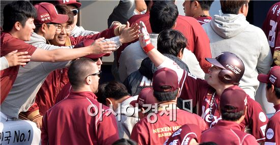 [잠실=아시아경제 김현민 기자] 프로야구 2015 포스트시즌 넥센 히어로즈와 두산 베어스의 준플레이오프 1차전이 10일 잠실구장에서 열렸다. 6회초 2사에서 넥센 박병호가 두산 선발 니퍼트를 상대로 좌월 추가 솔로 홈런을 치고 동료들과 기쁨을 나누고 있다.