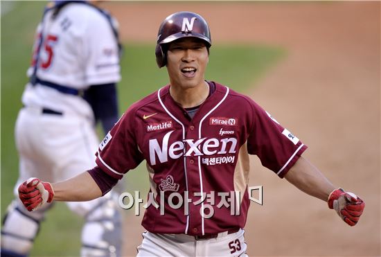 [잠실=아시아경제 김현민 기자] 프로야구 2015 포스트시즌 넥센 히어로즈와 두산 베어스의 준플레이오프 1차전이 10일 잠실구장에서 열렸다. 8회초 1사 1,3루에서 넥센 박병호의 추가 1타점 중견수 희생플라이 때 득점을 올린 3루주자 고종욱이 환호하고 있다.