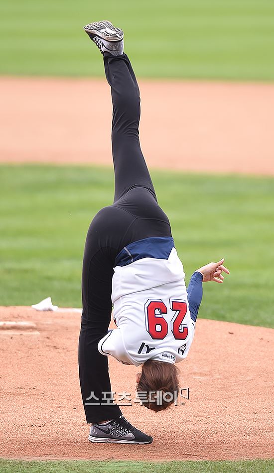 [아시아경제 온라인이슈팀] '2015 타이어뱅크 KBO리그' 포스트시즌 준플레이오프 2차전 두산 베어스-넥센 히어로즈 프로야구경기가 11일 오후 서울 송파구 잠실동 잠실야구장에서 열렸다. 신수지가 시구자로 나섰다.