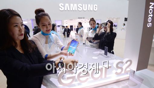[고양=아시아경제 최우창 기자] 14일 경기도 고양시 킨텍스 제1전시장에서 올해로 46회째를 맞는 '2015 한국전자산업대전'이 열린 가운데 행사장을 찾은 시민들이 삼성 부스에서 다양한 전자제품을 체험하고 있다.
