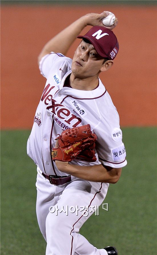 [목동=아시아경제 김현민 기자] 프로야구 2015 포스트시즌 두산 베어스와 넥센 히어로즈의 준플레이오프 4차전이 14일 목동구장에서 열렸다. 넥센 선발투수 양훈이 역투하고 있다.