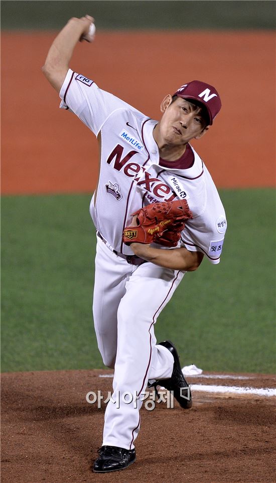 [목동=아시아경제 김현민 기자] 프로야구 2015 포스트시즌 두산 베어스와 넥센 히어로즈의 준플레이오프 4차전이 14일 목동구장에서 열렸다. 넥센 선발투수 양훈이 역투하고 있다.