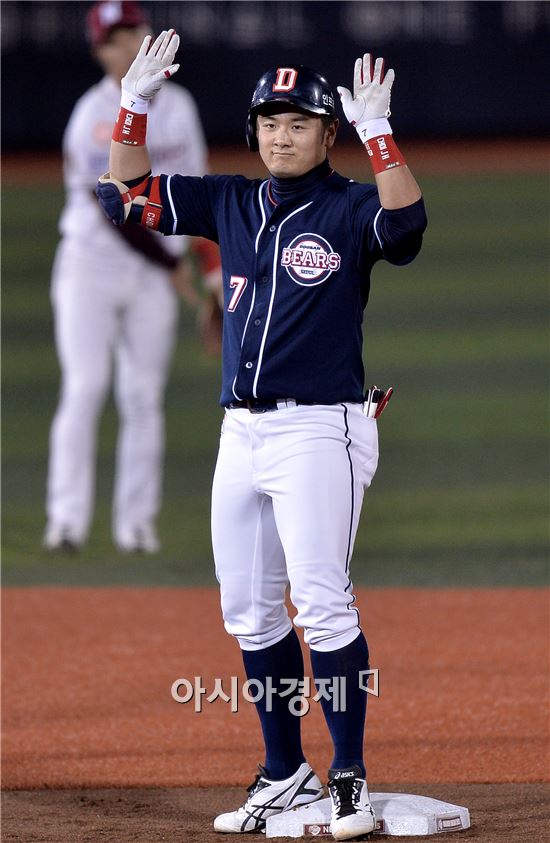 [목동=아시아경제 김현민 기자] 프로야구 2015 포스트시즌 두산 베어스와 넥센 히어로즈의 준플레이오프 4차전이 14일 목동구장에서 열렸다. 2회초 1사에서 두산 최주환이 좌익수 옆 2루타를 치고 출루하고 있다.