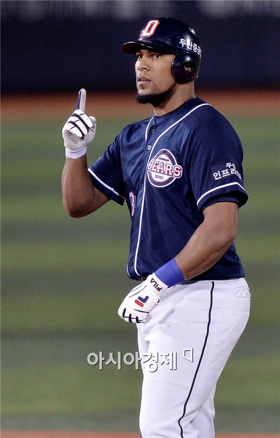 [목동=아시아경제 김현민 기자] 프로야구 2015 포스트시즌 두산 베어스와 넥센 히어로즈의 준플레이오프 4차전이 14일 목동구장에서 열렸다. 2회초 1사 2루에서 두산 로메로가 선취 1타점 2루타를 치고 세리머니하고 있다.