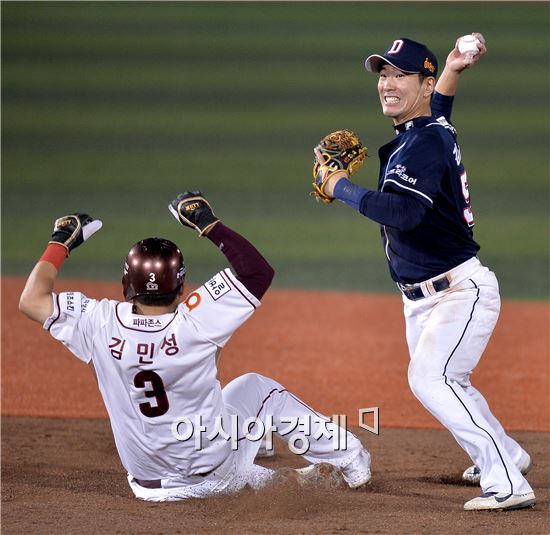 [목동=아시아경제 김현민 기자] 프로야구 2015 포스트시즌 두산 베어스와 넥센 히어로즈의 준플레이오프 4차전이 14일 목동구장에서 열렸다. 2회말 1사 1,3루에서 두산 유격수 김재호가 넥센 스나이더의 2루수 앞 땅볼 때 1루주자 김민성을 포스아웃시켰으나 1루로는 던지지 못하고 있다.