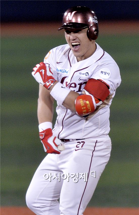 [목동=아시아경제 김현민 기자] 프로야구 2015 포스트시즌 두산 베어스와 넥센 히어로즈의 준플레이오프 4차전이 14일 목동구장에서 열렸다. 4회말 2사 1,2루에서 넥센 박동원이 역전 2타점 좌중간 2루타를 치고 출루한 뒤 환호하고 있다.