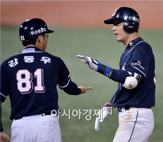 [목동=아시아경제 김현민 기자] 프로야구 2015 포스트시즌 두산 베어스와 넥센 히어로즈의 준플레이오프 4차전이 14일 목동구장에서 열렸다. 7회초 1사 2,3루에서 두산 김재호가 2타점 적시타를 치고 강동우 코치와 하이파이브하고 있다.