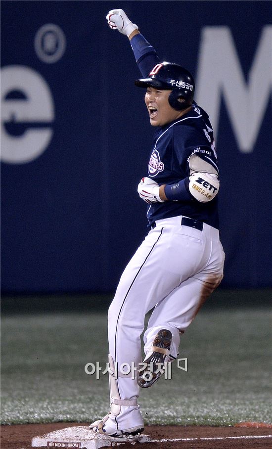 [목동=아시아경제 김현민 기자] 프로야구 2015 포스트시즌 두산 베어스와 넥센 히어로즈의 준플레이오프 4차전이 14일 목동구장에서 열렸다. 9회초 1사 1,3루에서 두산 양의지가 동점 1타점 2루타를 치고 상대 실책을 틈타 3루까지 출루한 뒤 포효하고 있다.