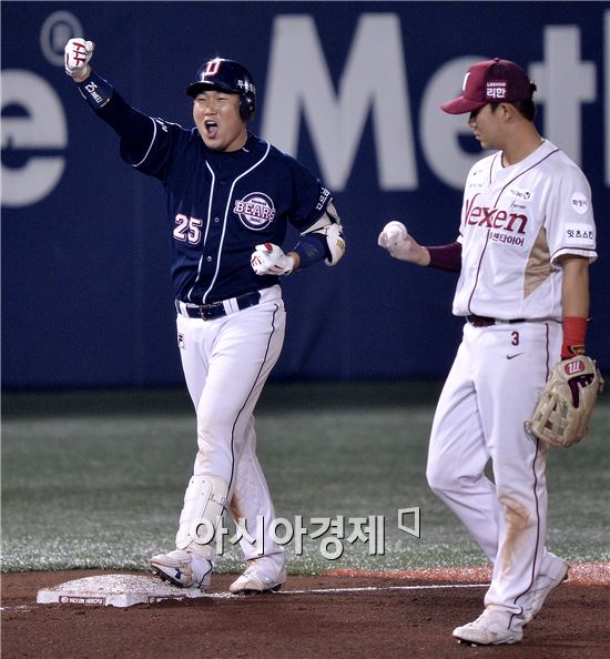 [목동=아시아경제 김현민 기자] 프로야구 2015 포스트시즌 두산 베어스와 넥센 히어로즈의 준플레이오프 4차전이 14일 목동구장에서 열렸다. 9회초 1사 1,3루에서 두산 양의지가 동점 1타점 2루타를 치고 상대 실책을 틈타 3루까지 출루한 뒤 포효하고 있다.