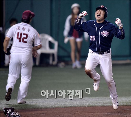 [목동=아시아경제 김현민 기자] 프로야구 2015 포스트시즌 두산 베어스와 넥센 히어로즈의 준플레이오프 4차전이 14일 목동구장에서 열렸다. 9회초 1사 1,3루에서 두산 최주환의 스트라이크 낫아웃 폭투 때 3루주자 양의지가 추가 득점에 성공한 뒤 포효하고 있다.
