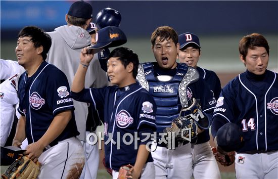 [목동=아시아경제 김현민 기자] 프로야구 두산 베어스가 14일 목동구장에서 열린 2015 포스트시즌 준플레이오프 4차전에서 넥센을 11-9로 꺾고 플레이오프 진출을 확정했다. 두산 양의지가(가운데) 동료들과 기뻐하고 있다.