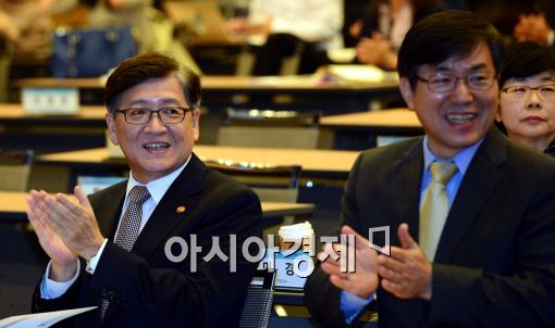 [아시아경제 최우창 기자] 정진엽 보건복지부 장관(왼쪽)과 김상호 한국보건사회연구원장이 19일 서울 중구 대한상공회의소에서 열린 '제3차 저출산·고령사회 기본계획 시안 공청회'에 참석해 박수를 치고 있다.