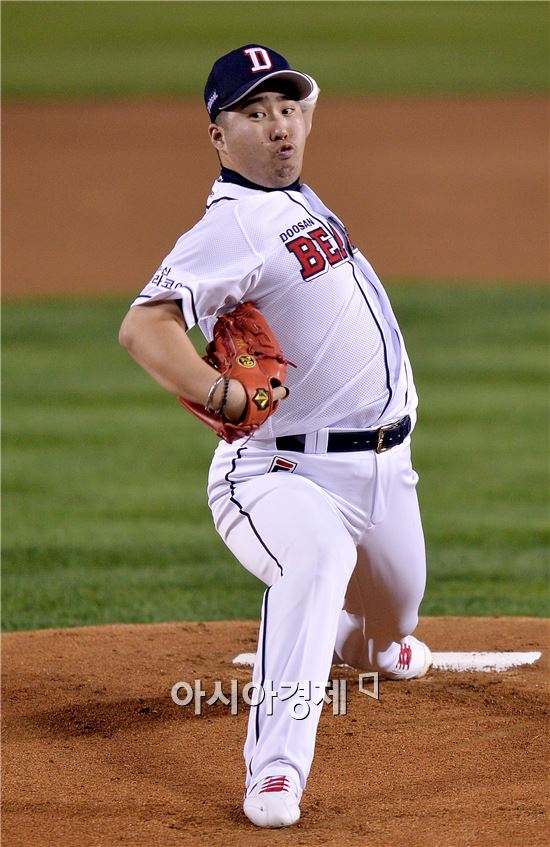 [잠실=아시아경제 김현민 기자] 프로야구 2015 포스트시즌 NC 다이노스와 두산 베어스의 플레이오프 3차전이 21일 잠실구장에서 열렸다. 두산 선발투수 유희관이 역투하고 있다.
