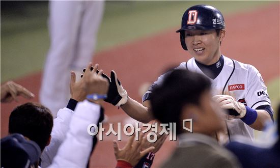 [잠실=아시아경제 김현민 기자] 프로야구 2015 포스트시즌 NC 다이노스와 두산 베어스의 플레이오프 3차전이 21일 잠실구장에서 열렸다. 2회말 2사 3루에서 두산 허경민의 2루수 땅볼 때 상대 실책을 틈타 득점을 올린 3루주자 정수빈이 동료들과 기뻐하고 있다.