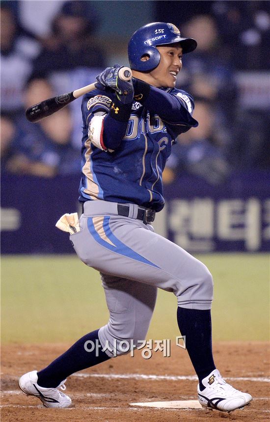 [잠실=아시아경제 김현민 기자] 프로야구 2015 포스트시즌 NC 다이노스와 두산 베어스의 플레이오프 3차전이 21일 잠실구장에서 열렸다. 3회초 1사 1,2루에서 NC 이종욱이 추가 1타점 적시타를 치고 있다.