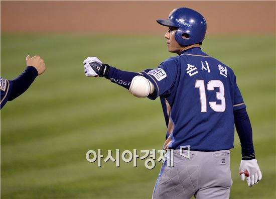 [잠실=아시아경제 김현민 기자] 프로야구 2015 포스트시즌 NC 다이노스와 두산 베어스의 플레이오프 3차전이 21일 잠실구장에서 열렸다. 3회초 1사 1,2루에서 NC 손시헌이 추가 1타점 적시타를 치고 전준호 코치와 하이파이브하고 있다.