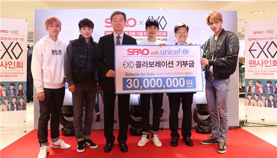 스파오는 티셔츠 판매로 조성된 기부금 3000만원과 명동점 고객들의 개별 기부금을 합쳐 총 3016만8550원을 후원하기로 하고, 이날 스파오 홍대점에서 열린 엑소 팬사인회에 서대원 유니세프 한국위원회 사무총장과 안성수 스파오 대표가 참석하여 기금 전달식을 가졌다.