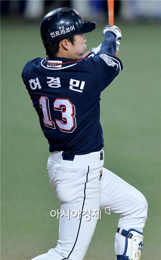 [대구=아시아경제 김현민 기자] 프로야구 2015 포스트시즌 두산 베어스와 삼성 라이온즈의 한국시리즈 1차전이 26일 대구구장에서 열렸다. 1회초 1사에서 두산 허경민이 삼성 선발 피가로를 상대로 선제 솔로 홈런을 치고 있다.