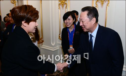[아시아경제 윤동주 기자] 아시아경제와 아시아경제TV 주최로 5일 서울 중구 롯데호텔에서 열린 '2015 아시아 여성 리더스 포럼'에 참석한 박용만 두산그룹 회장 및 대한상의 회장과 박세리 전 프로골퍼 선수가 인사를 하고 있다.