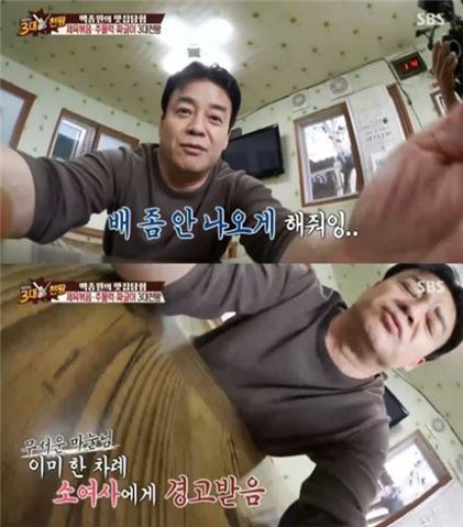 이날 백종원은 자신 배를 집중적으로 향하는 카메라를 향해 "배 쪽으로 카메라를 잡지 말아라. 아내(소유진)가 배가 나왔다고 지적하더라"며 "슬픈 게 니트를 입을 계절이 왔는데 못 입고 있다"고 말했다.