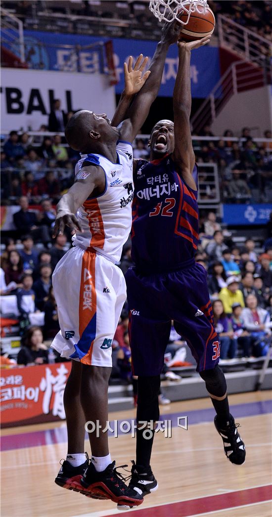 [고양=아시아경제 김현민 기자] 2015-2016 프로농구 고양 오리온스와 인천 전자랜드의 경기가 8일 고양체육관에서 열렸다. 오리온스 헤인즈가 상대 뱅그라의 슛블록에 막히고 있다.