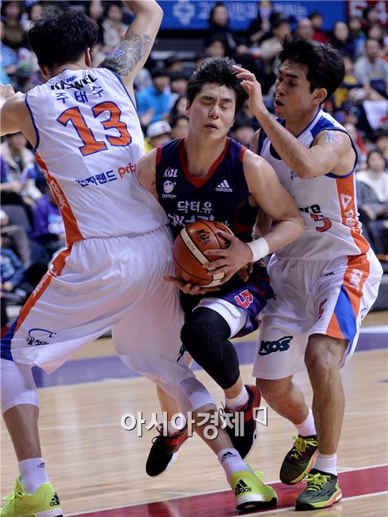 [고양=아시아경제 김현민 기자] 2015-2016 프로농구 고양 오리온스와 인천 전자랜드의 경기가 8일 고양체육관에서 열렸다. 오리온스 한호빈이 상대 정병국과 주태수의 수비를 뚫고 공격하고 있다.