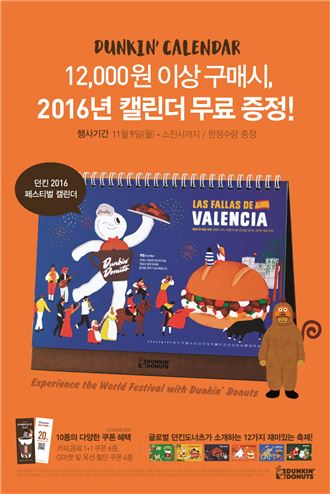 [아시아경제 최서연 기자] 던킨도너츠가 9일부터 던킨도너츠 제품 1만2000원 이상 구매 시 ‘2016 페스티벌 캘린더’를 증정하는 프로모션을 진행한다.