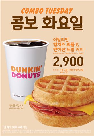 11월 매주 화요일(10일, 17일, 24일)마다 진행되는 콤보 화요일 프로모션은 이탈리안 햄치즈 와플과 맨하탄 드립 커피로 구성된 ‘이탈리안 햄치즈 와플 콤보’를 하루 종일 2900원에 만나볼 수 있는 행사다. 이탈리아의 고급 햄인 ‘모타델라’와 향긋한 메이플 와플이 어우러진 ‘이탈리안 햄치즈 와플’은 바쁜 아침 식사대용으로 담백하고 든든하게 즐길 수 있는 제품이다. 세트에 포함된 맨하탄 드립 커피는 오렌지 주스로 변경이 가능하다.
