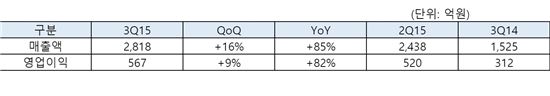 매출은 전년 동기 대비 85%가 늘어난 2818억원을 기록했다. 이는 역대 최대 규모의 분기 매출이다.