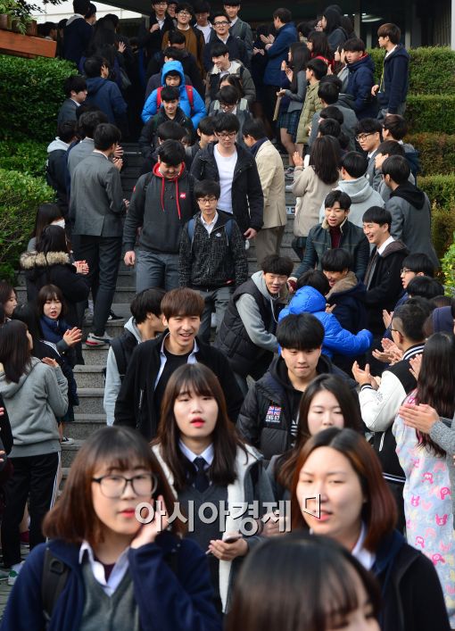 [아시아경제 최우창 기자] 대학수학능력시험일을 하루 앞둔 11일 서울 서초고등학교에서 수험생들이 학교를 나서며 후배들의 응원을 받고 있다.