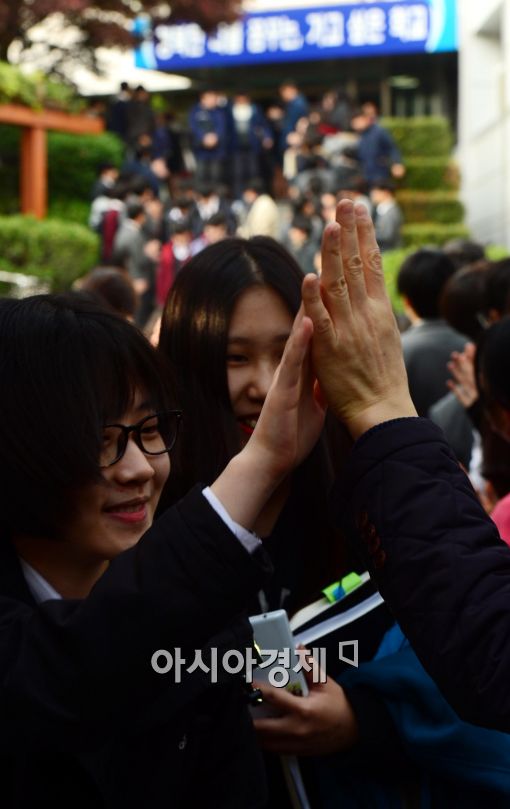 [아시아경제 최우창 기자] 대학수학능력시험일을 하루 앞둔 11일 서울 서초고등학교에서 한 수험생이 학교를 나서며 선생님의 응원을 받고 있다.