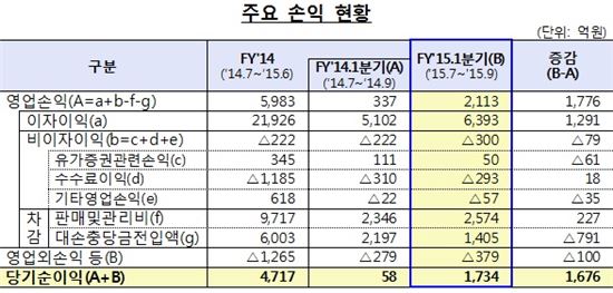 12일 금융감독원은 저축은행의 2015년 회계년도 1분기(2015년7월~9월) 당기순이익이 1734억원을 기록했다고 발표했다. 이는 지난해 같은 기간(58억원) 대비 1676억원 증가한 수치로, 5분기 연속 순이익을 냈다.