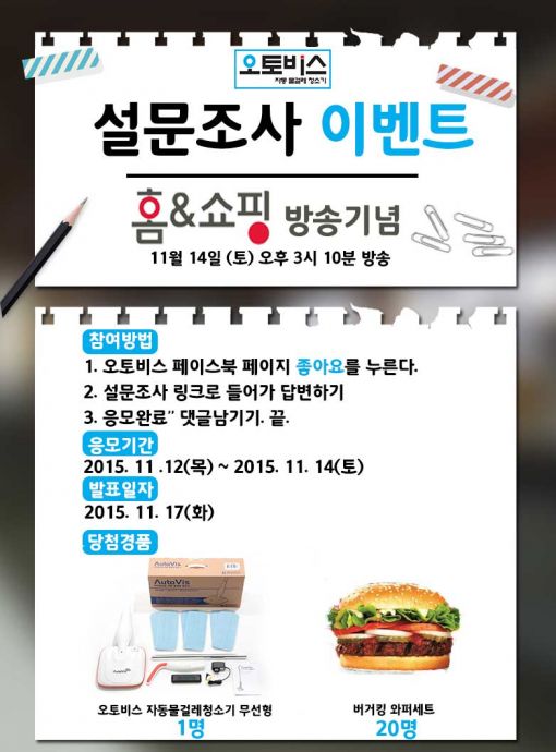 이번 이벤트는 오는 14일 홈쇼핑 방영시간이 끝날 때까지 진행되며, 오토비스 공식 페이스북 페이지(www.facebook.com/ksautovis)에서 간단한 설문조사를 통해 참여할 수 있다.