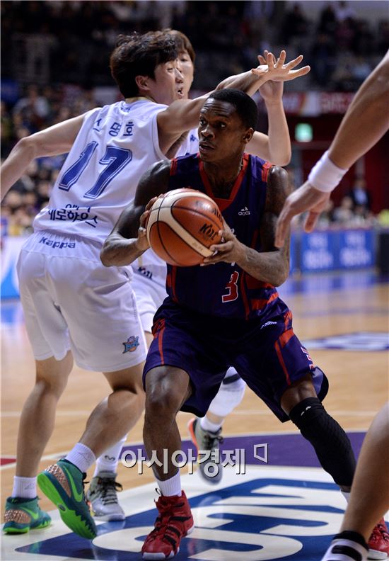 [고양=아시아경제 김현민 기자] 2015-2016 프로농구 고양 오리온과 전주 KCC의 경기가 15일 고양체육관에서 열렸다. 고양 조 잭슨이 상대 신명호의 수비를 뚫고 공격하고 있다.