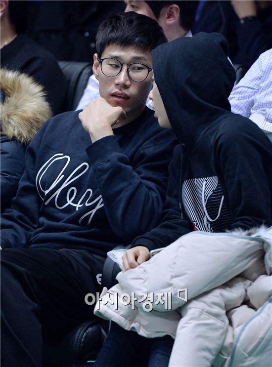 [인천=아시아경제 김현민 기자] '2015-2016 KDB생명 여자프로농구' 신한은행과 KDB생명의 경기가 23일 인천 도원체육관에서 열렸다. 안양 KGC 오세근이 아내와 함께 경기를 관람하고 있다.