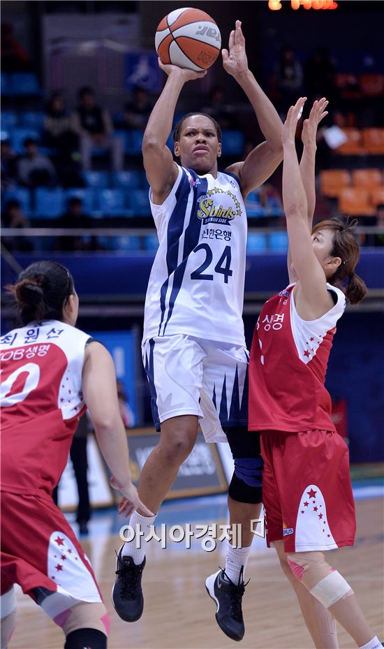 [인천=아시아경제 김현민 기자] '2015-2016 KDB생명 여자프로농구' 신한은행과 KDB생명의 경기가 23일 인천 도원체육관에서 열렸다. 신한은행 커리가 상대 이경은의 수비를 뚫고 슛하고 있다.