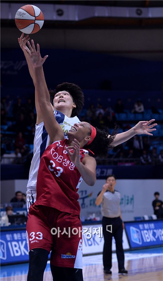 [인천=아시아경제 김현민 기자] '2015-2016 KDB생명 여자프로농구' 신한은행과 KDB생명의 경기가 23일 인천 도원체육관에서 열렸다. 신한은행 하은주가 상대 플레넷과 리바운드를 다투고 있다.