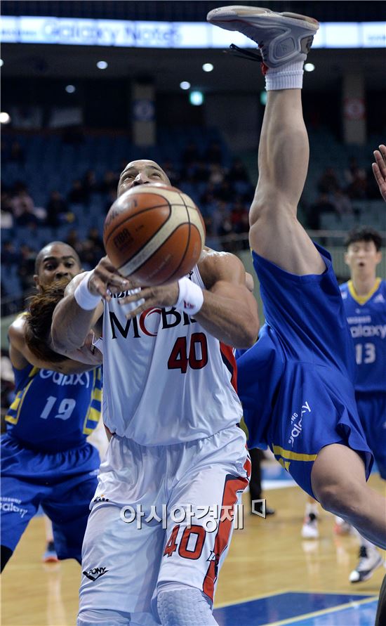 [잠실=아시아경제 김현민 기자] 2015-2016 프로농구 서울 삼성과 울산 모비스의 경기가 26일 잠실실내체육관에서 열렸다. 모비스 클라크가 상대 송창무의 거친 수비에 공을 놓치고 있다.