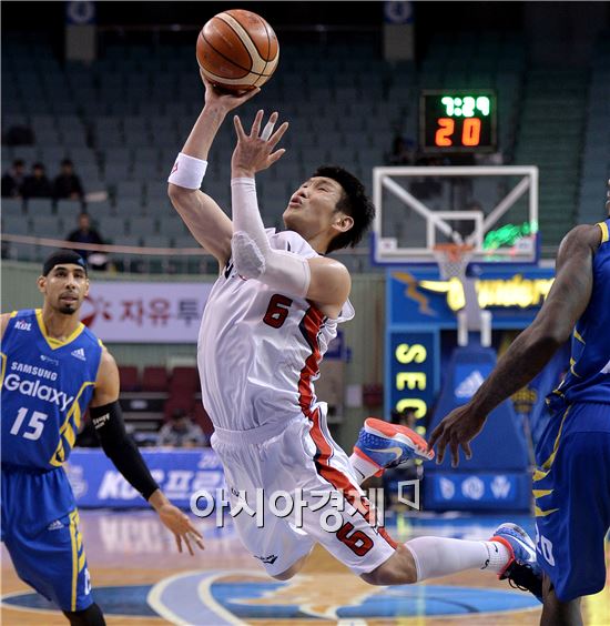 [잠실=아시아경제 김현민 기자] 2015-2016 프로농구 서울 삼성과 울산 모비스의 경기가 26일 잠실실내체육관에서 열렸다. 모비스 양동근이 상대 수비를 뚫고 공격하고 있다.