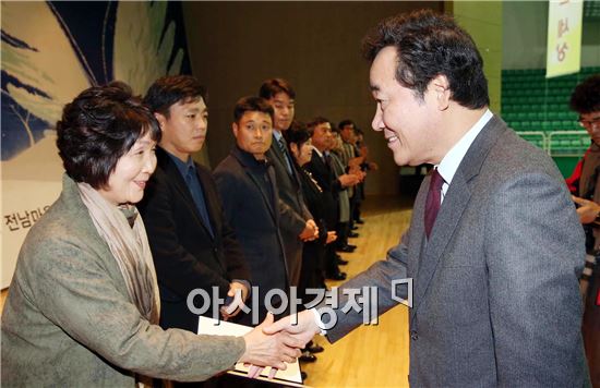 이낙연 전남지사가 27일 오전 화순 하니움스포츠센터에서 열린 2015년도 전남 사회적경제인 한마당 행사에 참석, 사회적경제 발전에 기여한 유공자에 대한 도지사 표창장을 수여하고 있다.사진제공=전남도