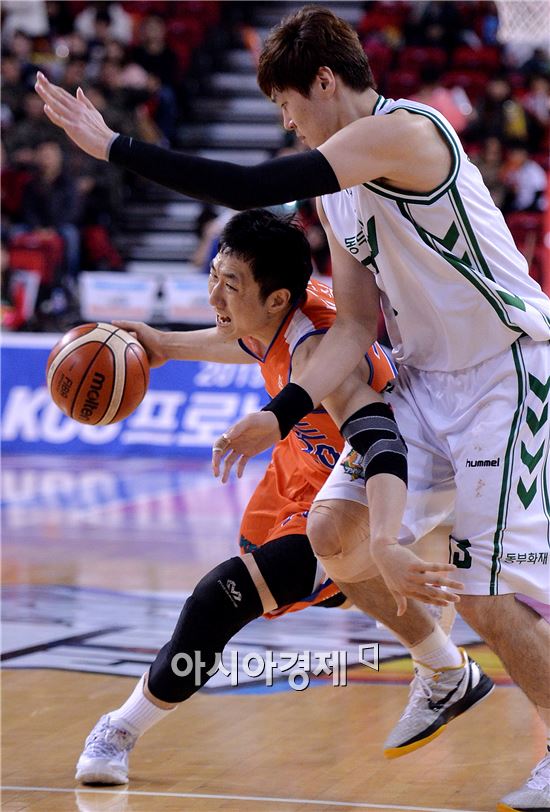 [인천=아시아경제 김현민 기자] 2015-2016 프로농구 인천 전자랜드와 원주 동부의 경기가 28일 인천 삼산월드체육관에서 열렸다. 전자랜드 정영삼이 상대 윤호영의 수비를 뚫고 공격하고 있다.